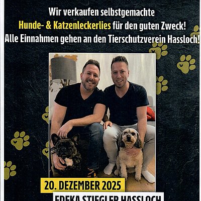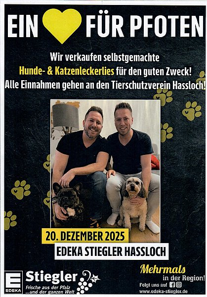 Am 20.12.2025 verkauft Edeka Stiegler selbstgemachte Hunde- und Katzenleckerlis. Alle Einnahmen der Aktion werden an den 1. Tierschutzverein Haßloch und Umgebung e.V. gespendet!