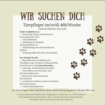 Wir suchen ab sofort eine Unterstützung in Vollzeit für unser Tierheim! Alle Details dazu sind in oben stehender Anzeige zu finden. Eine abgeschlossene tiermedizinische oder tierpflegerische Ausbildung wäre super, ist aber keine Voraussetzung! Eine Übernahme nach der Befristung ist geplant.