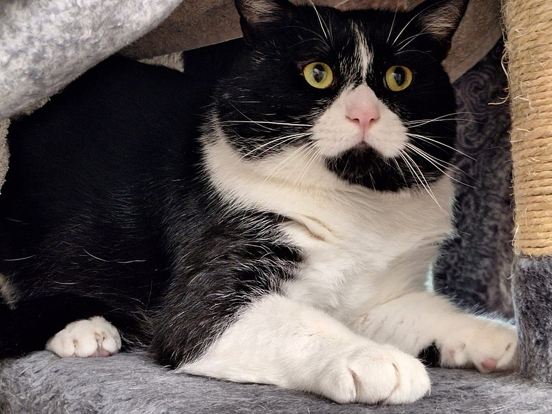 Der Schatz ist ein großer Tuxedo (amerik. für Smoking) Kater mit der ganz typisch schwarz-weißen Fellfarbe.Durch sein rundes Köpfchen und die schönen Bäckchen sieht er aus wie ein kleiner Bär.