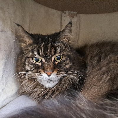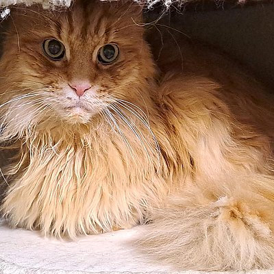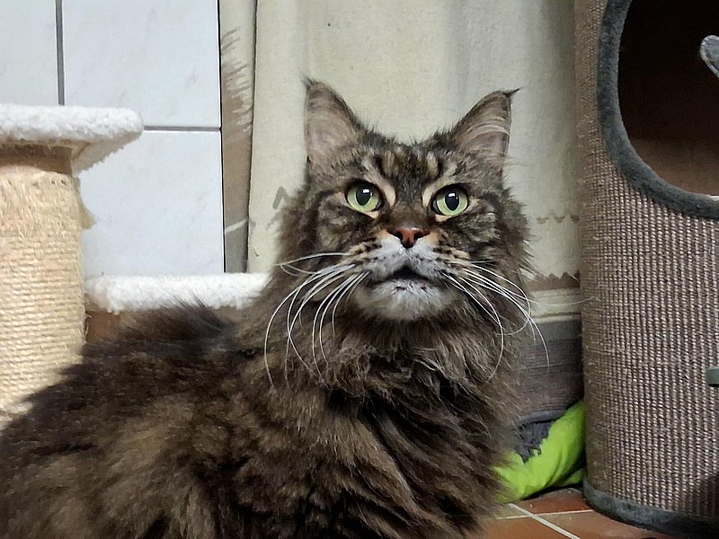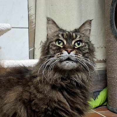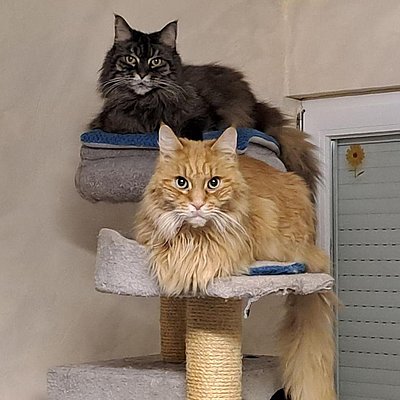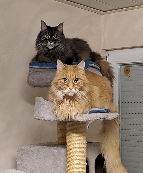 Die beiden Maine Coon Senioren (beide 13 Jahre alt) hängen sehr aneinander. Leider ist Filou gesundheitlich angeschlagen und wird vermutlich nicht mehr sehr alt werden.